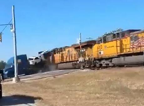 ABD'nin Texas eyaletine bağlı Schertz şehrinde araç taşıyan tır, hemzemin geçitte mahsur kaldı. 50 METRE…
